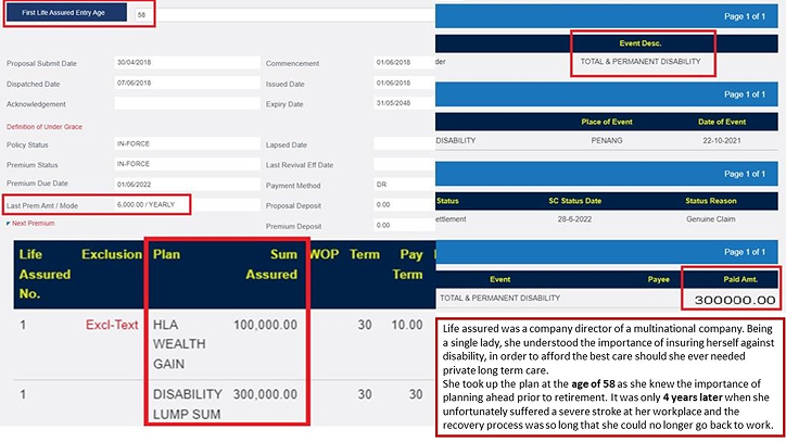 At 58, a single multinational company director secured disability coverage to ensure quality long-term care if needed. 4 years later, she suffered a severe stroke at work, and the long recovery meant she could not return to her job. Her policy paid RM 300,000, providing vital financial support.